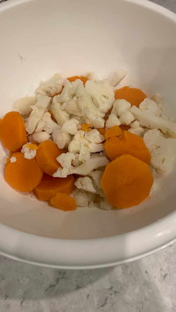 1 среден батат (обелен и нарязан на кубчета) ½ карфиол (накъсан на розички) 2–3 с.л. кокосово масло (или друго позволено) 2 скилидки чесън (по желание) ½ ч.л. куркума ½ ч.л. черен пипер сол на вкус прясно изцеден сок от ½ лимон (твоята добавка)
