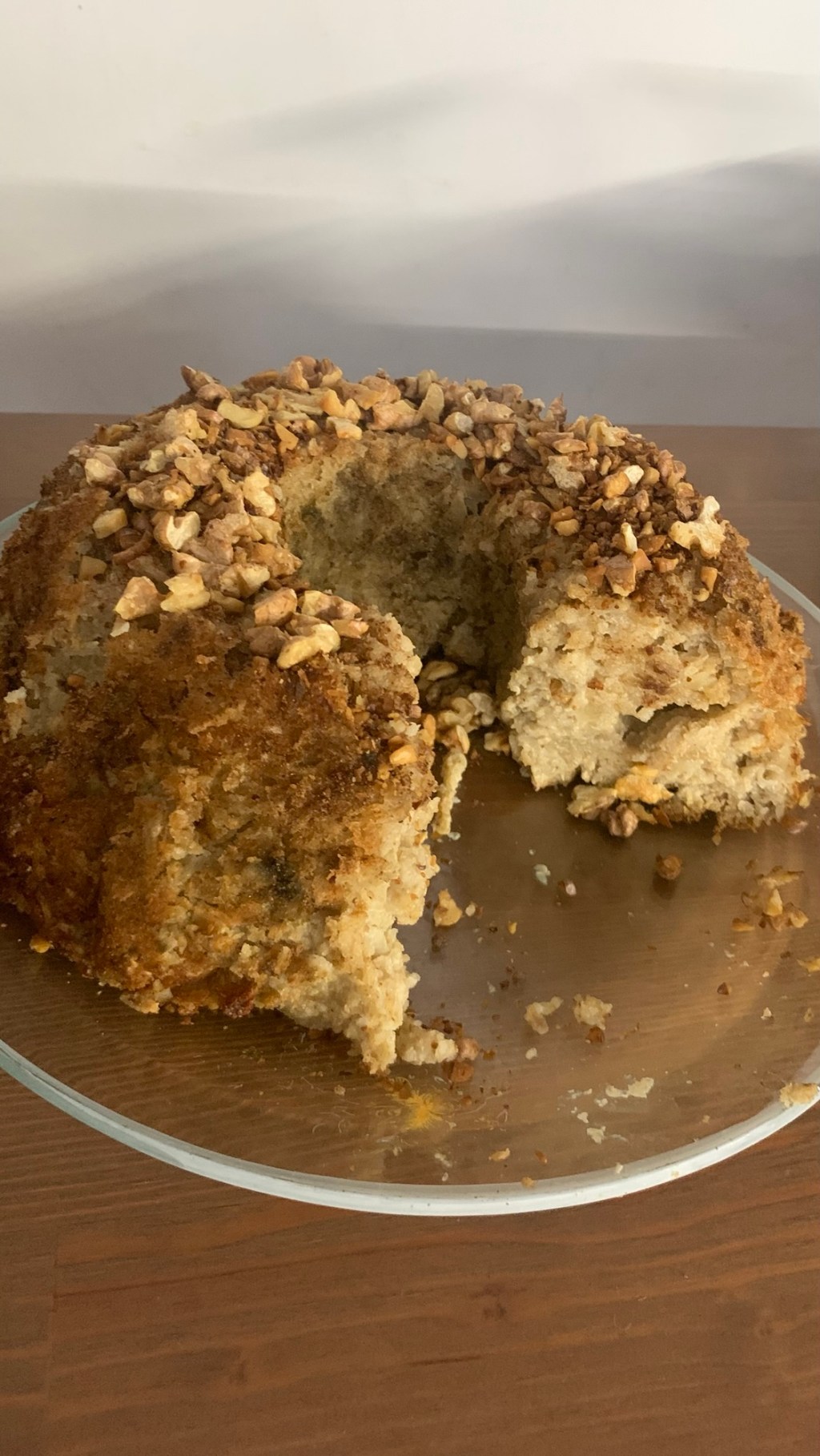 Загрей фурната на 170°C (горен/долен реотан). Разбий яйцата с еритритола до леко побеляване. Добави разтопената мазнина и меда. Прибави киноата, настърганите ябълки, лимоновата кора и лимоновия сок. Смеси сухите съставки: канела, сол, бакпулвер. Добави към сместа. Накрая добави орехите и разбъркай внимателно. Изсипи в форма, покрита с хартия за печене. Печи 35–40 минути. Провери с клечка — трябва да излиза леко влажна, не суха. Остави кекса да изстине напълно, преди да режеш.